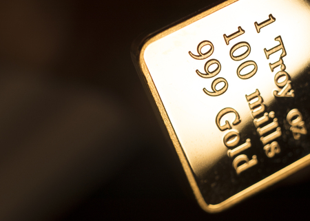 Fine solid gold 999.9 one ounce bullion ingot precious metals bar closeup isolated photo.