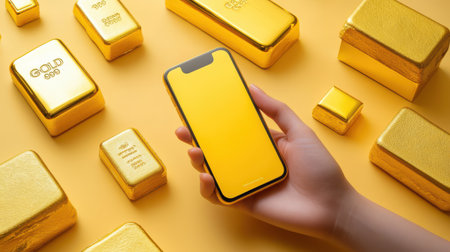 A striking arrangement of gold bars stacked on a vibrant yellow background, capturing the essence of wealth and luxury with soft lighting to create an inviting atmosphere.