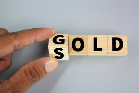 wooden cube with the word gold is sold. gold has been sold. the concept of gold is sold