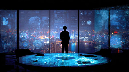 A man stands before a large window overlooking a cityscape. The scene is illuminated by the glow of the city lights and displays projected onto a round table. The image features a dark, cool color palette with a sense of technology and ambition, suitable for illustrating business or innovation themes.