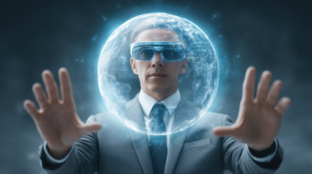 A businessman in a suit wearing augmented reality glasses interacts with a holographic globe and digital data, showcasing future technology and global connectivity.