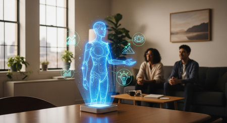 A futuristic digital assistant, represented by a holographic figure, providing information and performing tasks