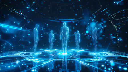 Luminous humanoid forms crafted from networked light nodes hover above radiant data discs in a sleek, cybernetic realm symbolizing advanced virtual connectivity.