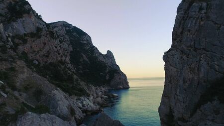 Top view of wild cliffs with blue sea on sky background. Shot. Rocky coast with calm water of blue sea reaching horizon on background of sky