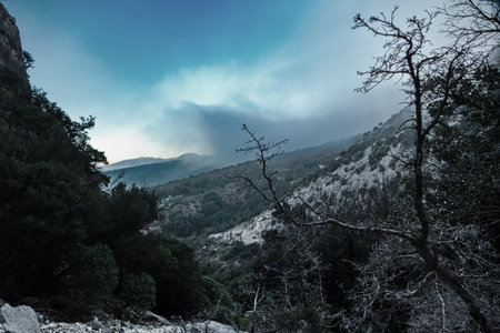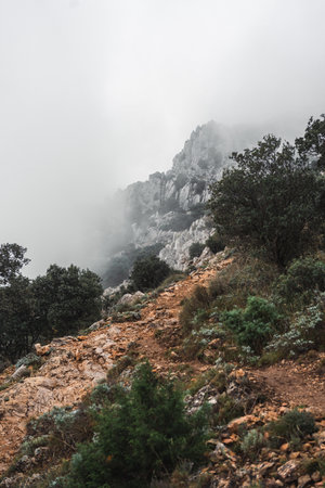 Foggy mountain trail with rugged rocks and dense greenery in Puig Campana, Spain. Ideal for hiking, adventure, travel inspiration, and nature exploration backgrounds.