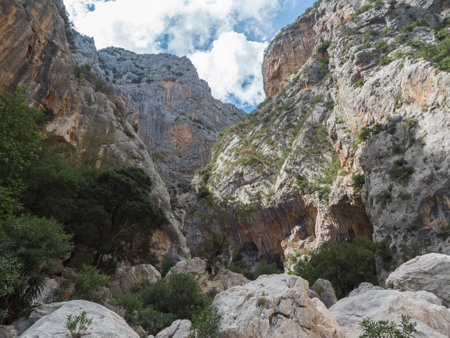 view of Gola Su Gorropu gorge with limestone rock walls, green bush and trees. Famous tourist hiking destination at Supramonte Mountains, Nuoro, Sardinia, Italy. Summer