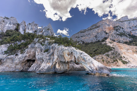 Turquoise sea and caves of Cala Luna beach in Sardinia, Italy