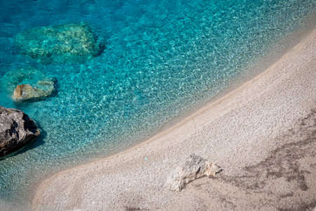 Hidden empty beach with pure clear turquoise sea water near white rock cliffs located in famous beach of Platys and Makrys gialos, Argostoli, Cefalonia island, Ionian, Greece