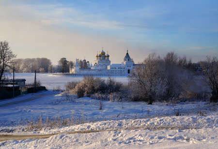 Tyumen, Russia - November 05.2016: Winter landscape with church of the Ascension and the wooden house