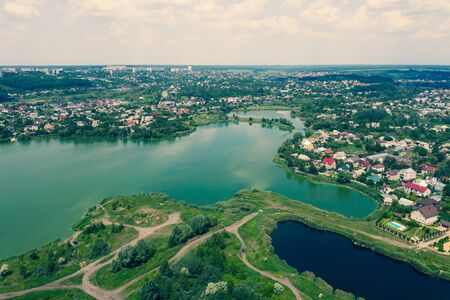 village near lake. Landscape of the village with beautiful views of the forest and lake
