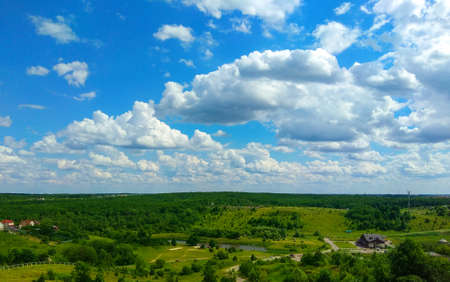 A rustic summer landscape in a temperate continental climate with houses, trees, green lawns and a pond. Banner. Horizontal orientation, selective focus.