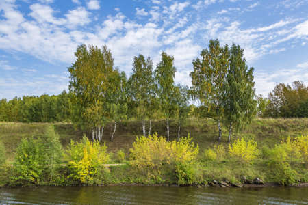 View of village Vasilievskoye on banks of Imbushka river on sunny autumn day, Sergiev Posad district, Moscow region, Russia