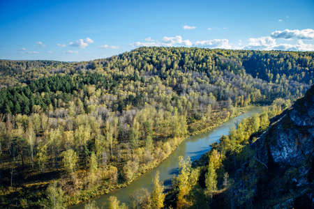 Beautiful view of wooded hills and river bends under clear blue sky. Peaceful natural landscape in a national park. Nature of Siberia.