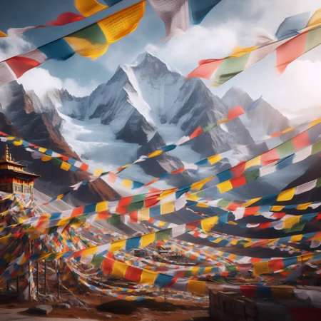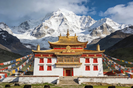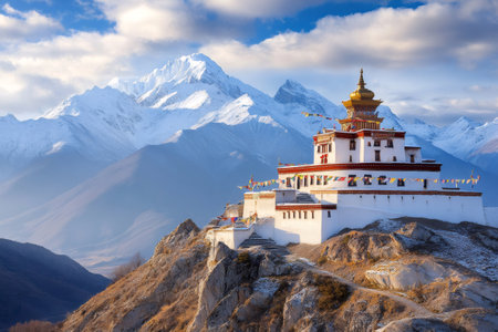 Majestic view of the monastery perched on a hilltop, prayer flags waving in the wind, with the imposing snowy peaks