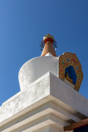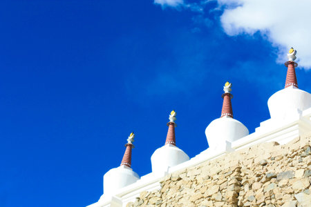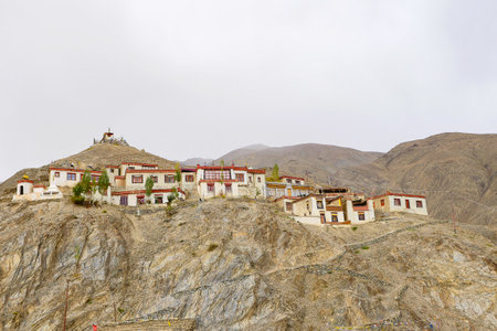 Beautiful landscape view of the ancient Gompa located on a hillock at Shey Palace Monastery, background with sky, clouds in Ladakh, Jammu and Kashmir,India.