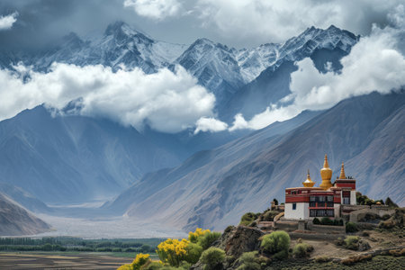 A small building sits atop a hill, with majestic mountains serving as the backdrop, A Tibetan monastery in the Himalayas, AI Generated