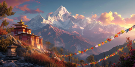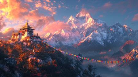 A serene temple adorned with colorful prayer flags stands against the backdrop of majestic snowy mountains illuminated by the sunrise. Resplendent.