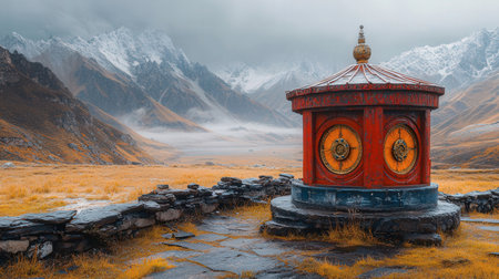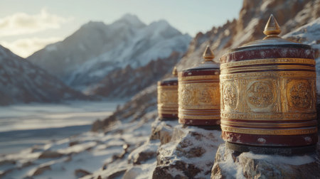 Explore the serene winter landscape featuring traditional prayer wheels against a backdrop of majestic snow-covered mountains, evoking a sense of peace and spirituality.