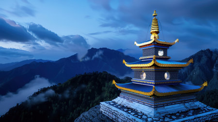 A striking pagoda rests on a mountain peak, surrounded by breathtaking views of nature. The serene dusk sky enhances the tranquil atmosphere, ideal for reflection.