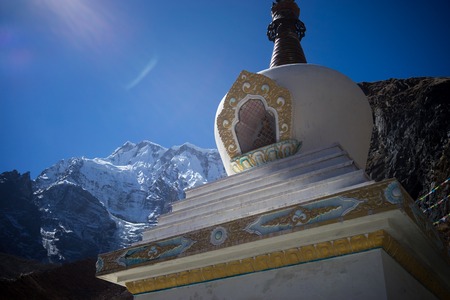 Tibetan Buddhist stupa on the way to Kyangjin Kharka village in Langtang National park in Nepal. The Langtang Valley is mainly inhabited by the Tamang people they mainly follow Tib