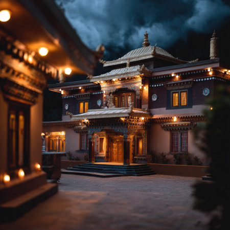 A stunning view of a traditional Tibetan temple illuminated at night, featuring intricate architecture and a dramatic, cloudy sky. The serene scene captures an essence of spirituality and tranquility, perfect for those seeking inspiration or a representation of cultural heritage.
