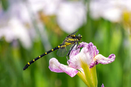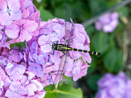 A Japanese variant of the common clubtail dragonfly, Ictinogomphus pertinax, rests on purple hydrangeas in a Japanese park beside a river.