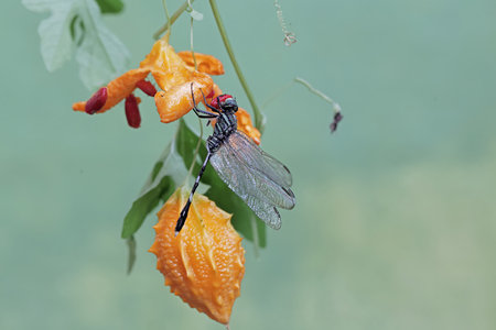 A macro shot of a dragonfly with delicate transparent wings on a flower. Generative AI illustration
