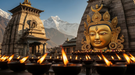 Golden Buddhist deity face, temple, Himalayas, burning oil lamps, Nepal