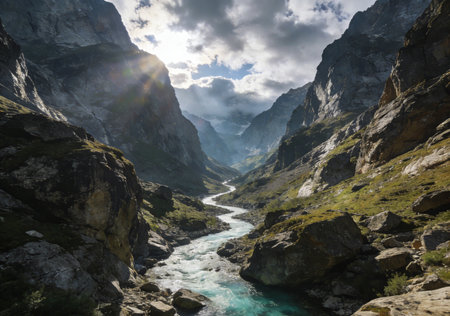 Explore a peaceful mountain valley featuring a flowing river surrounded by lush greenery and majestic peaks under a cloudy sky. Perfect for nature lovers.