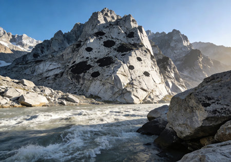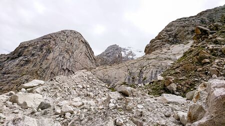 Foothills of giant glacier. Amazing rocky relief with snow and ice. Wonderful huge mountain rocky natural wall with small waterfalls. Water from glacier. Fantastic artwork of majestic highland nature.