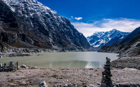 Mountain landscape with lake and snow in Tsorolpa Lake in Nepal.