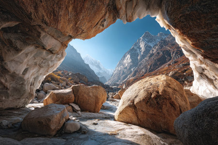 An interior cave view frames a breathtaking vista of a mountain range. The scene features rocky formations in warm tones contrasted by a cool blue sky. The composition emphasizes depth, with natural lighting enhancing the textures of the stone. Ideal for visual storytelling and editorial content.