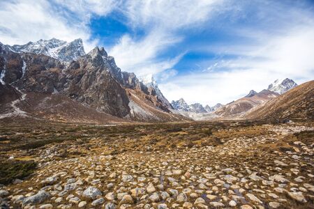 Beautifull Khumbu glacier mountains landscape at the Everest Base Camp trek in the Himalaya, Nepal. Himalaya landscape and mountain views.