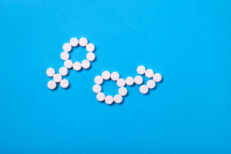 Gender symbols of male and female origin from white round pills on blue background with copy space place for text. Top view.