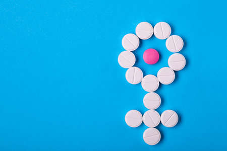 Gender symbol of woman from pills on blue background top view with copy space place for text, concept about female health.