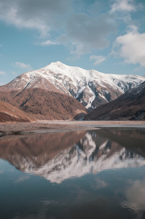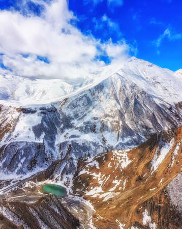 A wonderful winterlandscape with a blue lake in the mountains next to the Friendship Arch, Gadauri, Georgia