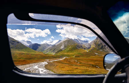 Landscape of beautiful mountain valley viewed from the car window. Travel and adventure concept.