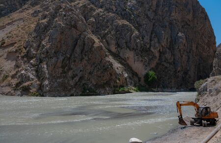 majestic high mountain. canyon view. rare vegetation travel through mountainous terrain. a reservoir in the middle of the mountains. bright orange excavator on the Bank of a mountain reservoir