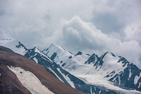 Dramatic mountains landscape with big snowy mountain ridge under cloudy sky. Dark atmospheric highland scenery with high mountain range in overcast weather. Awesome big mountains under gray clouds.