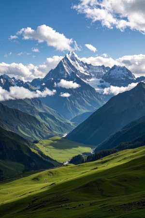 Majestic Snowy Mountain Peak Basks in Bright Sunlight, Offering Stunning Alpine Scenic Views