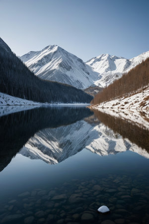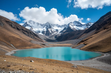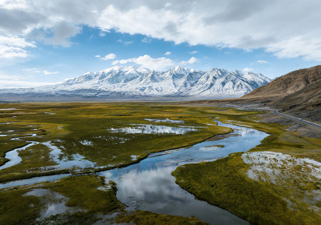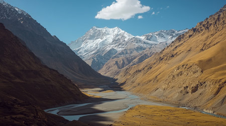 Stunning mountain landscape captured in a remote valley during a clear day with snow-capped peaks and a winding river