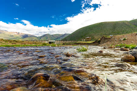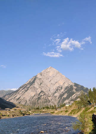 inspiring nature, high mountains against a clear blue sky, mountain river