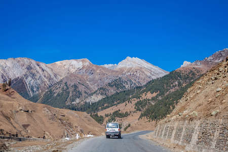 snowy mountain peaks on the Ala Bel pass, Bishkek Osh Highway M41 in Kyrgyzstan