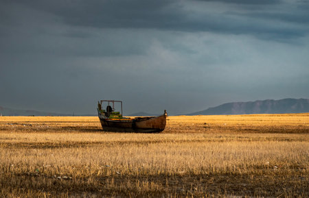 A unique scene of a boat resting on a golden wheat field, showing the effects of drought and environmental change.