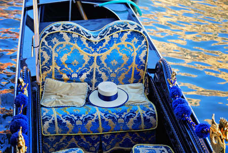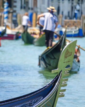 Typical boat of the city of Venice called GONDOLA on the navigable canal and the metal prow with the characteristic shape