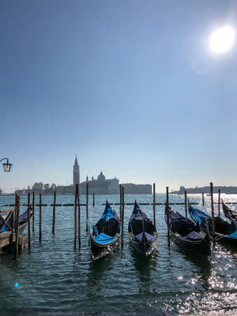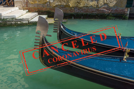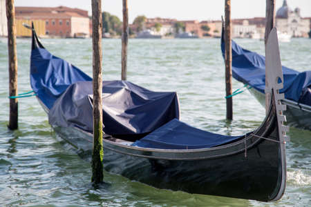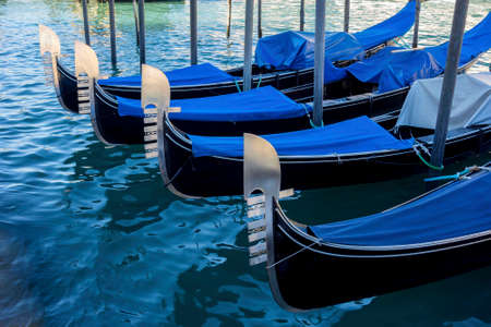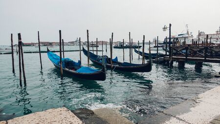 Close up of a two gondolas and the blue water of a Venetian canal, in Venice, Italy. Travel vacations canceled because of pandemic of coronavirus Covid-19, conceptual photo.