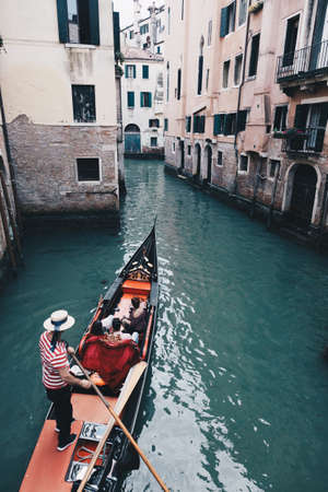 Venice, Italy - May 30 2023: Traditional gondola ride on the narrow water canals.Tourists in Venice.