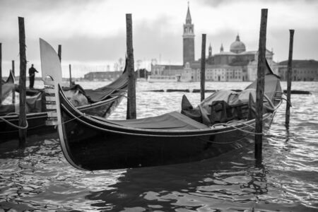 Black and white detail minimalist picture with gondolas moored on Grand Canal near Saint Mark square
