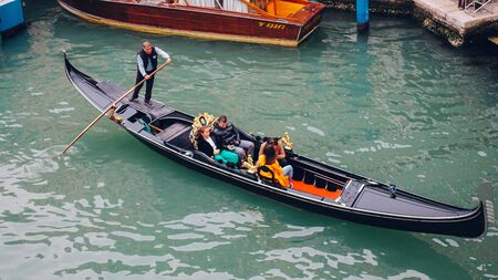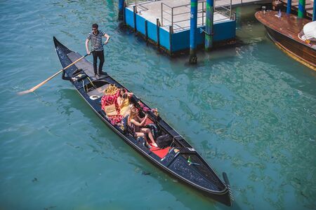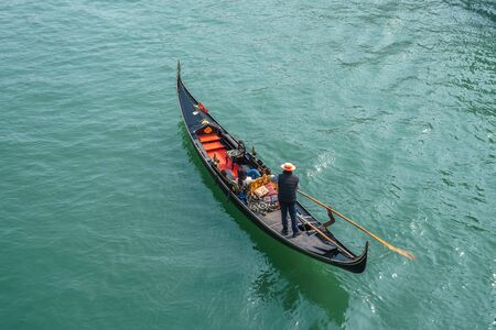 Venice, Italy - May 25, 2019: overhead view of gondola with tourist at grand canal. summer vacation