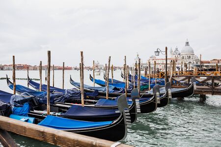 river, blue gondolas and Santa Maria della Salute in Venice, Italy
